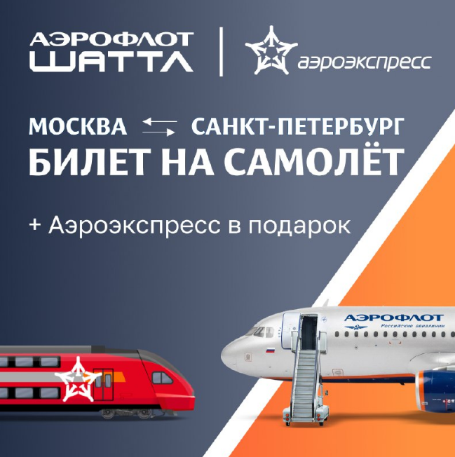 С 16 февраля до 15 апреля* купите билет по программе «Аэрофлот Шаттл» между Москвой (Шереметьево) и Санкт-Петербургом (Пулково) и получите бесплатный билет на наш поезд или автобус в/из аэропорта.